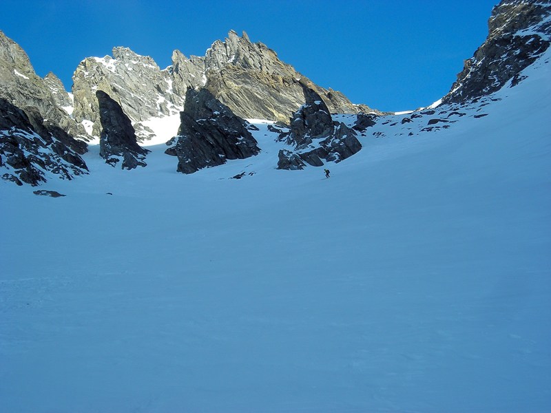 Molliamo gli scia poco sotto i 3000 per affrontare la parte alpinistica finale. Prima un canalino
